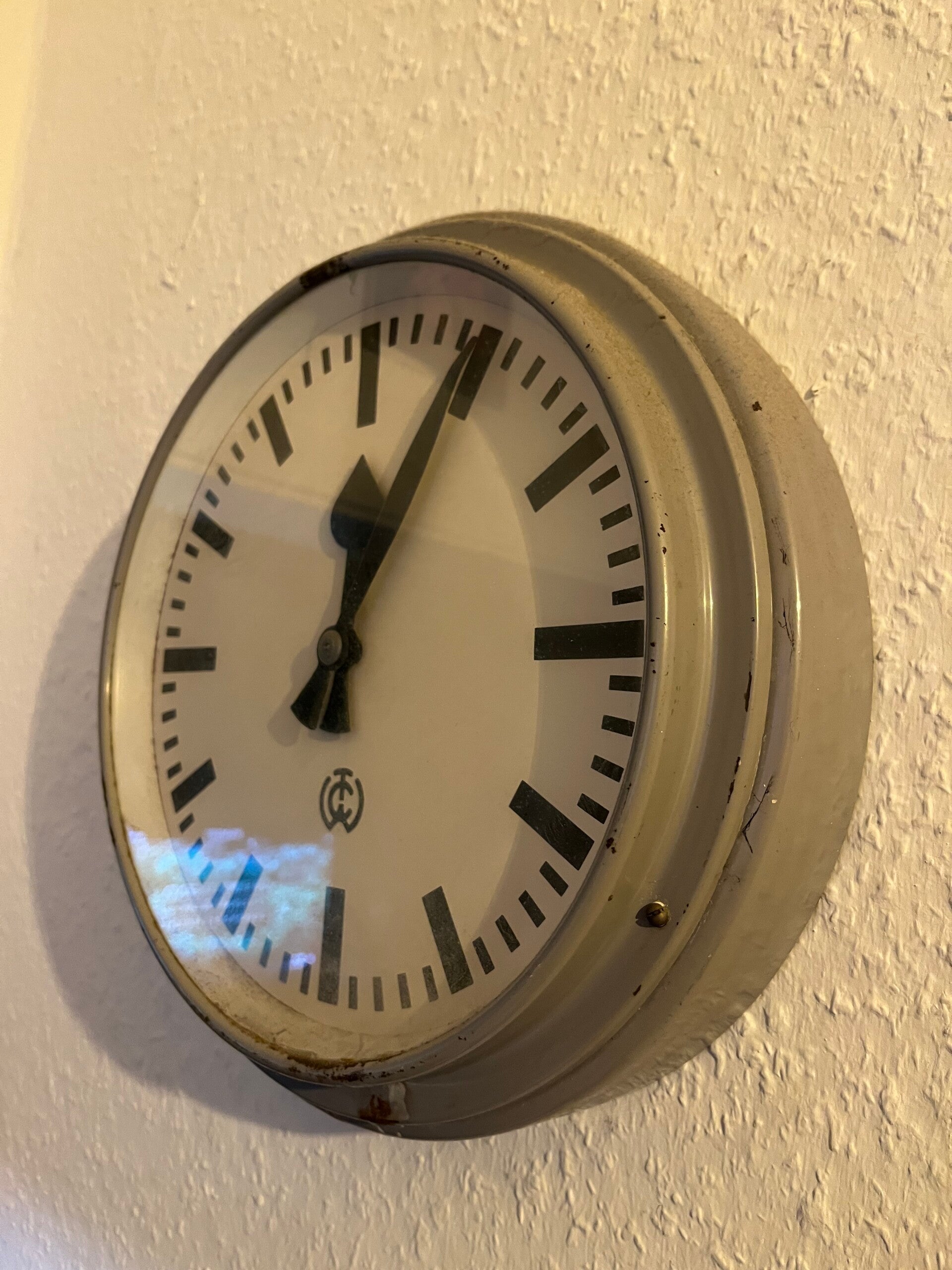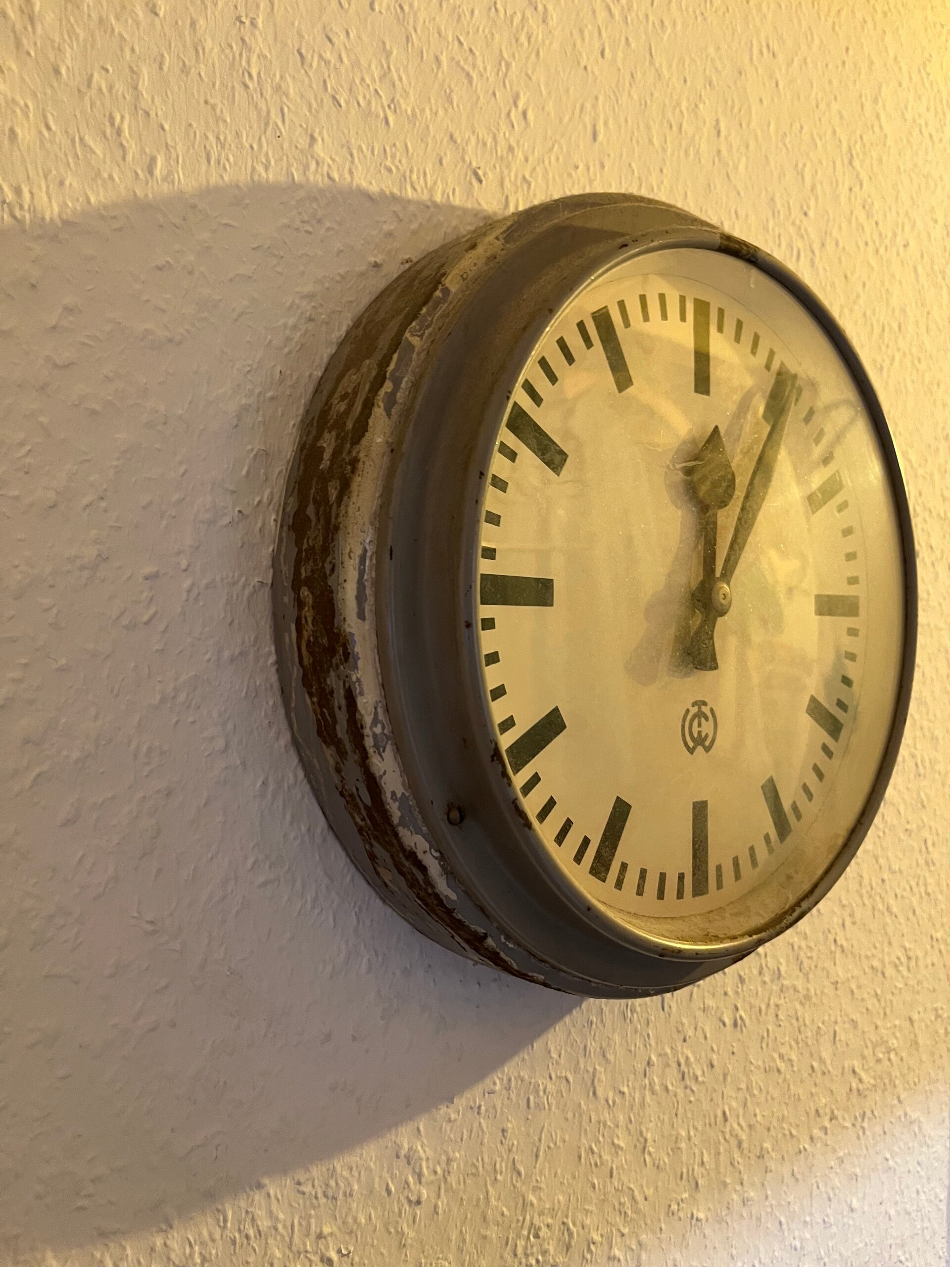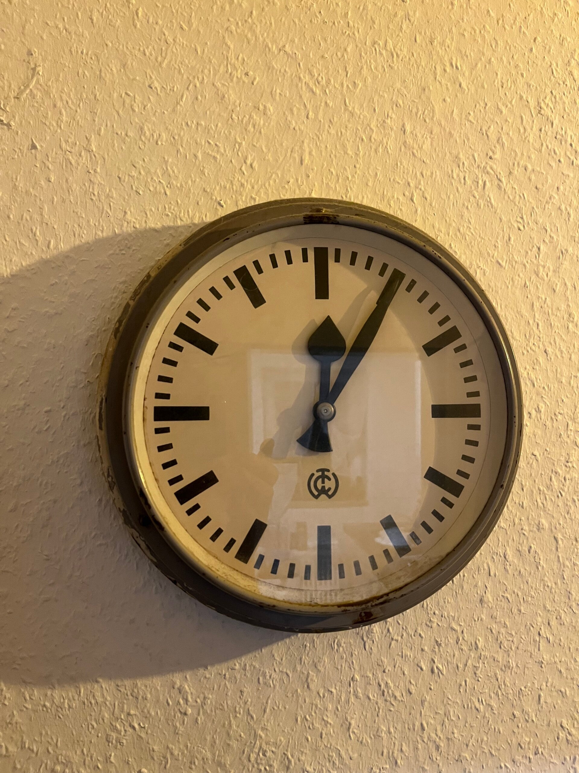Eine alte Wanduhr von Thyssen Krupp aus der Mensa Dortmund hing unten in der Kantine alter unbekannt.